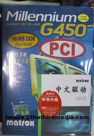 | 自从Matrox的G450的三款显卡上市以来,已经很久没有见到G450的新产品了,不过今天笔者在市场上得知,又有两款新的G450显卡到货了。